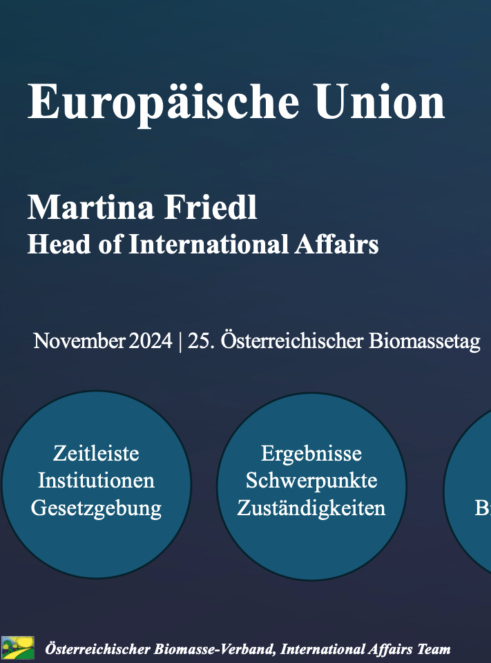 Biomasse ist ein Eckpfeiler der Energiewende. Das Team für Internationale Beziehungen des Österreichischen Biomasse-Verbands (International Affairs, IA) hat das Ziel, auf globaler Ebene die CO2-neutrale Energiegewinnung mit diesem erneuerbaren Rohstoff voranzutreiben. Dafür informiert, vernetzt und unterstützt es wichtige Entscheidungsträger auf internationaler, nationaler und regionaler Ebene.