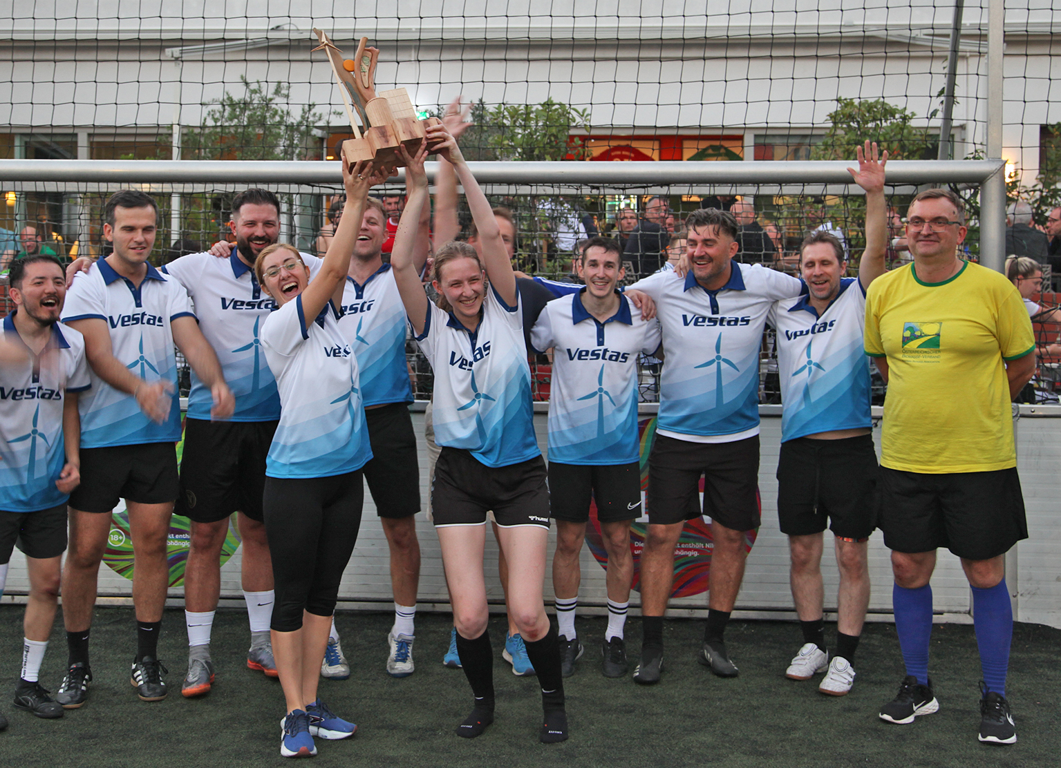 (AFU) – 25 Mannschaften spielten heuer um den beliebten Holzenergie-Pokal beim EnergiewendeCUP. Zum 10. Male trafen sich Branchenvertreter zum freundschaftlichen Duell in der WestSideSoccer Arena. Vestas konnte ihren Vorjahrestitel verteidigen und den Turniersieg für sich verbuchen – gefolgt von der Mannschaft von Energy3000. Im kleinen Finale landeten die Vertreter von ÖBB und BMLUK. Sie belegten beide den dritten Platz und glänzten spielerisch genauso wie in Bezug auf Fairness. Ein Lob und Dank muss den zahlreichen TeilnehmerInnen ausgesprochen werden.